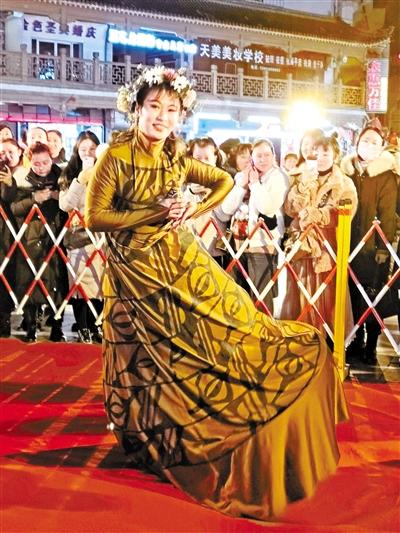 當(dāng)晚7時(shí)許,途經(jīng)表演現(xiàn)場(chǎng)的人流從四面八方聚攏于此,人們頻頻舉起手機(jī)將鏡頭對(duì)向眼前裙袂飛揚(yáng)、舞姿優(yōu)美的“大地灣女神”和頷首微笑、靜若處子的“東方微笑”,一時(shí)間,閃光燈忽明忽暗此起彼伏,行人你來我往人聲鼎沸,步行街頃刻間歡聲笑語、熱鬧非凡。記者發(fā)現(xiàn),扮作“不倒翁”的“女神”模仿大地灣出土的人頭瓶外部特征,而一旁采用懸浮藝術(shù)呈現(xiàn)的“小沙彌”,打禪靜坐、頷首微笑。