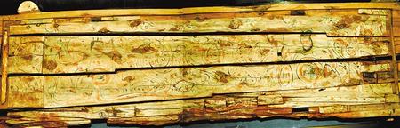 1998年新城魏晉南墓出土。這副完整的木棺由棺身和棺蓋組成,棺蓋內(nèi)側有一長方形凹面,內(nèi)彩繪伏羲女媧圖。伏羲女媧人首蛇身,兩尾相交,伏羲在右,左手執(zhí)矩,女媧在左,右手執(zhí)規(guī)。伏羲女媧周圍飾云氣紋。棺身呈長方體,兩檔頭用墨線勾畫星象圖,棺內(nèi)側四壁彩繪幃帳、絹帛、蠶繭等圖形。