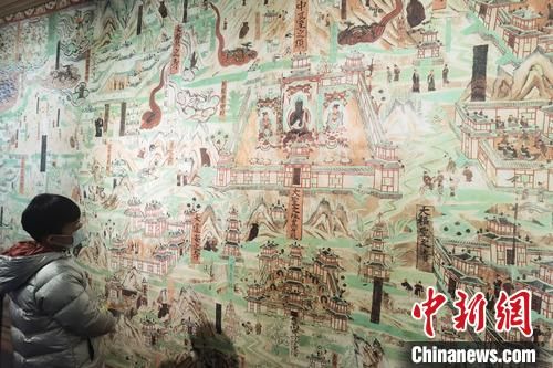 2021年1月29日,坐落于蘭州的敦煌藝術館內高保真復制壁畫吸引民眾參觀。近日,經過提升改造的敦煌藝術館重新開放。敦煌藝術館展覽內容有高保真莫高窟壁畫、1:1復制洞窟、分層壁畫立體再現、3D打印佛像雕塑、敦煌雕塑三維影像。 楊艷敏 攝
