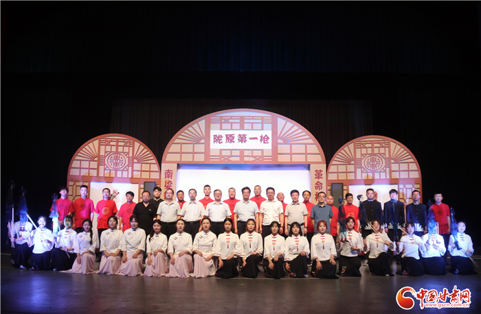《隴原第一槍》全劇分希望、播火、誆宴、奪槍、功捷5場,演出團(tuán)隊分為前臺演唱組、樂隊伴奏組、影人挑纖組、嘛簧幫唱組,演職人員中有國家級非遺代表性傳承人2人,省級非遺代表性傳承人2人,市級、縣級代表性傳承人近10人,加上隴東音樂學(xué)院學(xué)生共50人參與了演出。