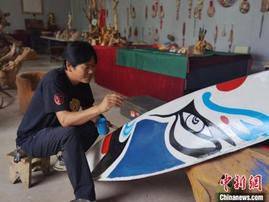 取材、挖空、刨光、勾線、著色……經(jīng)過這些步驟,一個馬勺臉譜就完成了。馬勺臉譜由中國民間社火臉譜演化而來,已有數(shù)千年歷史,系列產(chǎn)品主要包括馬勺臉譜、梭子臉譜、鏟子臉譜、木锨臉譜等。9月初,甘肅省隴南市徽縣馬勺臉譜的省級傳承人馬龍,依舊在工作室創(chuàng)作。今年47歲的他,堅守馬勺臉譜的制作技藝已有20余載,不僅傳承了社火臉譜和京劇臉譜的古韻,而且創(chuàng)新了貼金、刻繪等技藝,在傳統(tǒng)中融入了現(xiàn)代造型和色彩元素。它的作品在網(wǎng)絡引起熱議:“臉譜畫在梭子上,厲害了。”“寶藏非遺,期待下次打卡。”