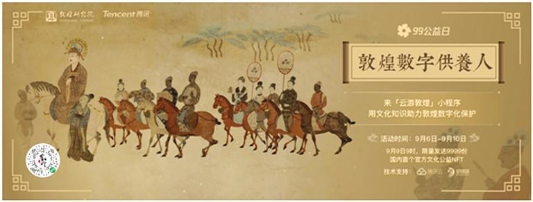 除了創(chuàng)意互動(dòng)帶來的新奇體驗(yàn),敦煌研究院與騰訊在“99公益日”還將發(fā)布文博行業(yè)首個(gè)公益NFT(Non-Fungible Token,非同質(zhì)化通證)藏品。9月9日9時(shí)開始,用戶在“云游敦煌”小程序參與文化答題即有機(jī)會(huì)獲得這款限量數(shù)字藏品。這份NFT藏品生動(dòng)呈現(xiàn)了《張議潮統(tǒng)軍出行圖》與《宋國河內(nèi)郡夫人宋氏出行圖》壁畫的細(xì)節(jié),并首次讓用戶在線上觀看到敦煌莫高窟第156窟的全景。