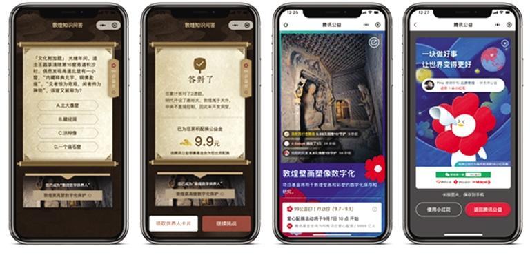 “云游敦煌”的“聲動(dòng)畫語”讓壁畫“活”了起來,用戶可以通過觸點(diǎn)的方式進(jìn)入到不同的篇章中,通過動(dòng)畫欣賞敦煌壁畫中晚唐時(shí)期的生活場景,并獲得與當(dāng)時(shí)社會(huì)民俗、服飾等相關(guān)的文化知識(shí)。觀看完動(dòng)畫后,用戶還可以通過參與文化問答挑戰(zhàn),為中國敦煌石窟保護(hù)基金會(huì)募集善款。答對(duì)題目越多,募集到的善款也將隨之增多??铐?xiàng)將由騰訊公益慈善基金會(huì)直接出資,并全部用于敦煌莫高窟第427窟、145窟、138窟的數(shù)字化保護(hù)工程。通過這種方式讓每一位參與的用戶,都能夠用自己的知識(shí)為石窟數(shù)字化保護(hù)助力,成為新時(shí)代的敦煌“數(shù)字供養(yǎng)人”。
