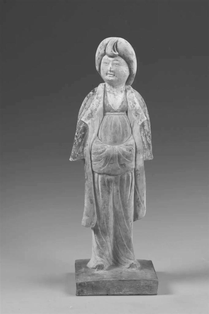 正大氣象,不僅在書法,也滲透到了民眾日常生活中。甘肅慶城博物館收藏有一件彩繪貴婦俑。這是唐開(kāi)元十八年(730 年)的作品,雙手籠于胸前,站在方形臺(tái)座之上,一副唐代貴婦的裝扮。