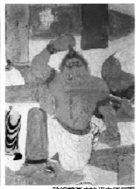 這幅壁畫講了這樣一個故事:外道勞度叉,約佛教弟子舍利弗斗法,失敗的一方要么選擇自盡,要么放棄原有的信仰而皈依佛門。經(jīng)過一番殊死搏斗,失敗后的外道,向舍利弗投降跪拜。