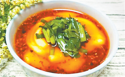 西峰的臊子面也很有地方特色,因其太辣,吃在嘴里不斷發(fā)出噓噓哨聲,故又稱“哨子面”。西峰臊子面制作獨特,吃法有趣,堪稱一絕。正如一首民歌唱到“十八省里(那個)轉(zhuǎn)一遍,好不過咱們西峰的臊子面”。西峰臊子面做工精細,制作分揉面、搟面、做湯、煮面幾個工序:“抻的面銀團團,搟的面紙一般,剁的面千條線,下到鍋里蓮花轉(zhuǎn),撈到筷子上打秋千,盛到碗里賽牡丹。”做成的臊子面條長如線,細如絲,長而柔韌,細而不斷,噴香美味,別具風味。