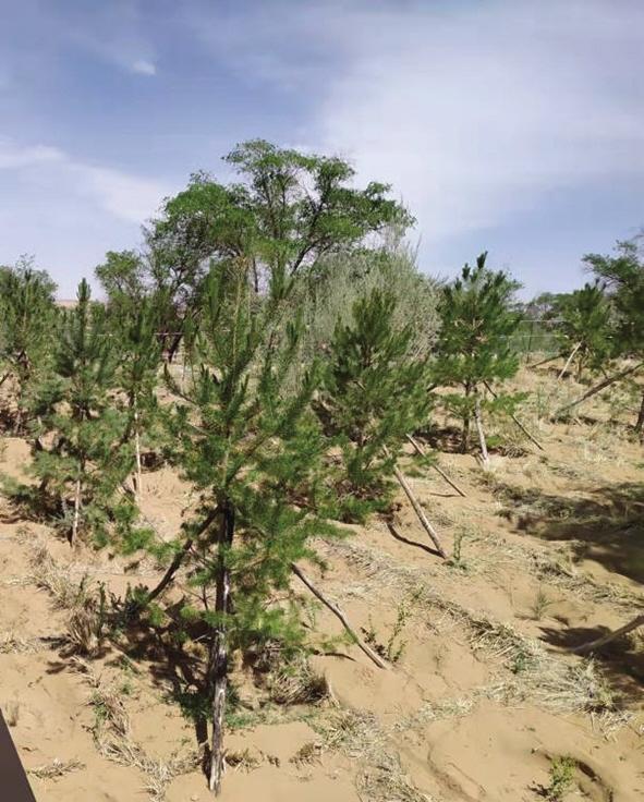 我和同伴撲進(jìn)沙海柔軟的懷抱。認(rèn)識(shí)到,再小的沙粒,也不能與塵世隔絕,我與沙,結(jié)緣于此。沙海里,一沙一世界。黃沙大膽赤裸地暴露在天幕蒼芎下,以大,以小,涵納無(wú)窮。“沙沙”的足音里,印下我深深淺淺兩行腳印,宣告著浪漫與踏實(shí)的存在。我來(lái)到習(xí)近平總書記親手栽植的“五棵松”下,仰視青松,綠云葳蕤,生機(jī)勃勃。總書記的關(guān)懷和鼓勵(lì),黃沙熱熱地、輕輕地長(zhǎng)出了更多綠色羽翼,這羽翼在不斷地生長(zhǎng)壯大,有“代代相傳”的精神,綠色終究會(huì)覆蓋全部騰格里。捧起一捧黃沙,細(xì)沙像嬰兒肌膚般的柔滑,我試圖用臉貼近它,這些黃色的小精靈,從我指縫間輕盈地流淌到松下,似乎在暗示我,要把自己的夢(mèng)筑進(jìn)治沙精神的瀚海里。科學(xué)家們已作出結(jié)論:沙漠是人類最后的寶地,別看它現(xiàn)在荒蕪,它里面蘊(yùn)藏著無(wú)盡的寶藏和財(cái)富。