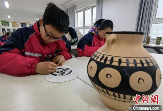近日,中新社中新網(wǎng)記者走進(jìn)蘭州市第三中學(xué)“彩陶”課堂,學(xué)生正在繪制彩陶圖案?!⒂裉摇z
