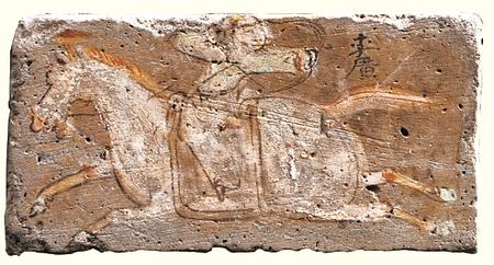 敦煌市博物館藏的西晉李廣射虎彩繪畫像磚表現(xiàn)的是“李廣射虎”的情景。李廣頭戴冠,八字須,著交領(lǐng)窄袖衣,系腰帶,下身著裈,騎于疾奔的馬上返身張弓待發(fā)。李廣射虎的故事被記載于司馬遷《史記》中,原文是:“廣出獵,見草中石,以為虎而射之,中石沒鏃,視之石也。因復(fù)更射之,終不能復(fù)入石矣。廣所居郡聞?dòng)谢?,嘗自射之。及居右北平射虎,虎騰傷廣,廣亦竟射殺之。”
