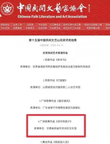 中國(guó)甘肅網(wǎng)3月14日訊(本網(wǎng)記者 張振國(guó))近日,第十五屆中國(guó)民間文藝山花獎(jiǎng)評(píng)獎(jiǎng)結(jié)果公示,由武威市舞蹈家協(xié)會(huì)副主席付泓創(chuàng)作、武威市涼州區(qū)文化館表演的作品《涼州攻鼓子》榮膺該獎(jiǎng)。該獎(jiǎng)項(xiàng)的獲得,是武威市文藝創(chuàng)作和非遺保護(hù)傳承的又一優(yōu)秀成果。