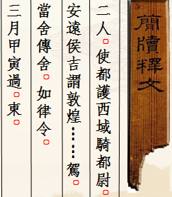 木簡(jiǎn)1枚(出土編號(hào):Ⅱ90DXT0213③:135),1990年出土于敦煌懸泉置遺址。長(zhǎng)7.2、寬1.3、厚0.25厘米。木簡(jiǎn)上殘,兩行書寫,字跡模糊,難以辨識(shí)。簡(jiǎn)文作“二人。使都護(hù)西域騎都尉、安遠(yuǎn)侯吉謂敦煌……駕,當(dāng)舍傳舍,如律令。三月甲寅過(guò),東。”。簡(jiǎn)中“使都護(hù)西域騎都尉”是西域都護(hù)的正式官名,“騎都尉”當(dāng)指以本官都護(hù)西域,是其本職,而“使”則突出了使職性質(zhì)。這是懸泉置記錄的一份傳文書,簡(jiǎn)文不完整,大意是說(shuō)某年三月甲寅日,西域都護(hù)鄭吉派遣的使者自西向東行,懸泉置依傳律規(guī)定,為停駐的兩名使者提供了飲食。該簡(jiǎn)文對(duì)研究懸泉置的傳舍制度,以及西漢王朝對(duì)西域行使管轄提供了重要的原始資料。現(xiàn)藏甘肅簡(jiǎn)牘博物館。