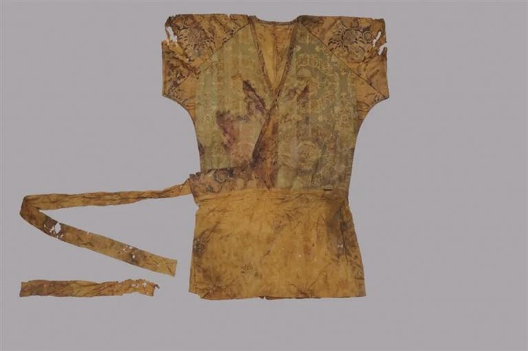 而在墓葬清理過程中,項目組經(jīng)清理確認(rèn)慕容氏墓棺木保存完整,棺內(nèi)見人骨一具,仰身直肢。墓主身著唐朝官服,頭枕雞鳴枕,挽髻,戴巾子并簪金釵,頭套金質(zhì)下頜托,面罩絲織覆面,腰束嵌金蹀躞帶,身前放置象牙笏板,蓋絲質(zhì)衾褥,身旁放置有盤、碗、碟、筷、勺、胡瓶等餐飲器具;筆、墨、紙、硯等文房用具;漆奩、鏡衣、粉盒、骨笄、木梳等梳妝用具;嵌金匕首、豹皮弓韜、貼金花漆木胡祿等武器裝備。墓主身著絲織衣物多達(dá)十四層,其內(nèi)包括絹、綺、綾、錦、羅、紗、緙絲等傳統(tǒng)絲織品種類兼?zhèn)?;團窠紋、對獅紋、翼馬紋、對鹿紋、鳳紋、麒麟紋等唐代絲織品紋樣兼?zhèn)?;夾纈、扎染、刺繡等唐代絲織品制作工藝兼?zhèn)?,為國?nèi)外所罕見。
