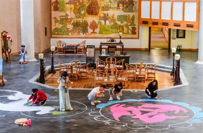 5月8日,母親節(jié),酒泉敦煌市沙文化館以敦煌莫高窟九色鹿壁畫為摹本,以彩色沙為原料,5人團隊通力合作,在敦煌鳴沙山下的敦煌山莊大堂“繪制”出長10米寬6米的大型九色鹿沙畫,同時“繪制”了一幅“三兔藻井”沙畫圖案,寓意天下母親“福祿安康”“一路平安”,祝天下母親節(jié)日快樂。