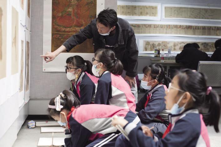 小學(xué)生近距離學(xué)習(xí)敦煌畫作 圖片由西北師范大學(xué)提供