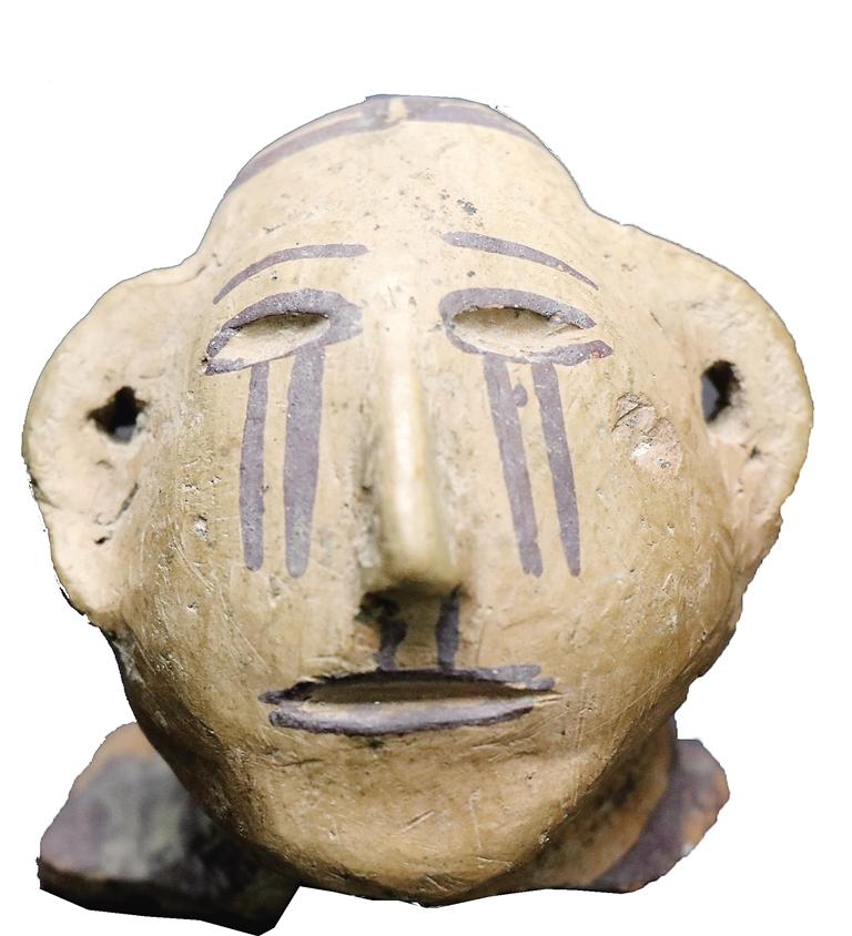 姓名:馬家窯文化馬廠類型人頭形彩陶器蓋 出生年代:距今約4350—4050年左右 住址:臨夏市博物館 體型:面部長6.5厘米,寬6.5厘米,頭頂至后頸長5.5厘米 自我描述: 我是國家一級(jí)文物。1992年,博物館工作人員從臨夏市王坪村村民手中收購了我。我是由泥質(zhì)紅陶捏塑而成,我的表面略磨光,施黑彩,窄額長臉,橢圓形眼,繪有眉毛,眼窩深陷,高鼻有鼻孔,雙耳較長、呈半圓形,雙耳有小孔,大嘴微張,發(fā)式為直發(fā)、中分。頭發(fā)、眼輪廓線、嘴輪廓線均為黑彩繪就。特別值得一提的是,在我的雙眼下方臉頰上的雙直線條,仿佛是奪眶而出的眼淚。
