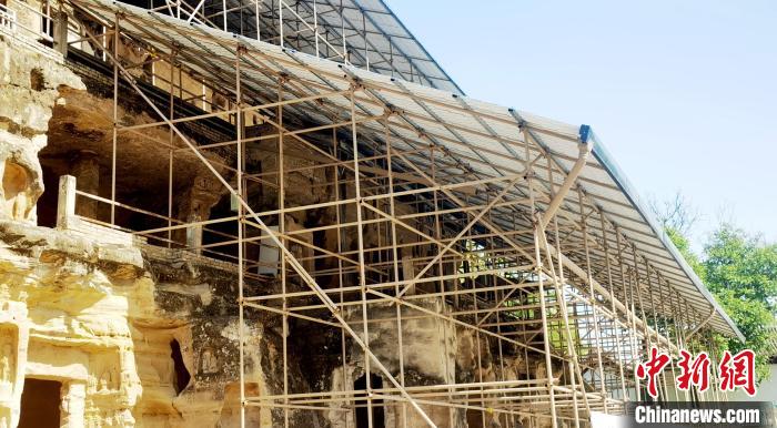 在北石窟寺,多體量多結(jié)構(gòu)腳手架支撐起保護(hù)棚,窟龕輪廓若隱若現(xiàn)。崔惠萍介紹說,該防水工程,屬于實(shí)驗(yàn)性,于2021年3月建成,能最大程度覆蓋遮擋崖體,保護(hù)崖面窟龕,防止雨水對石窟的沖蝕破壞。