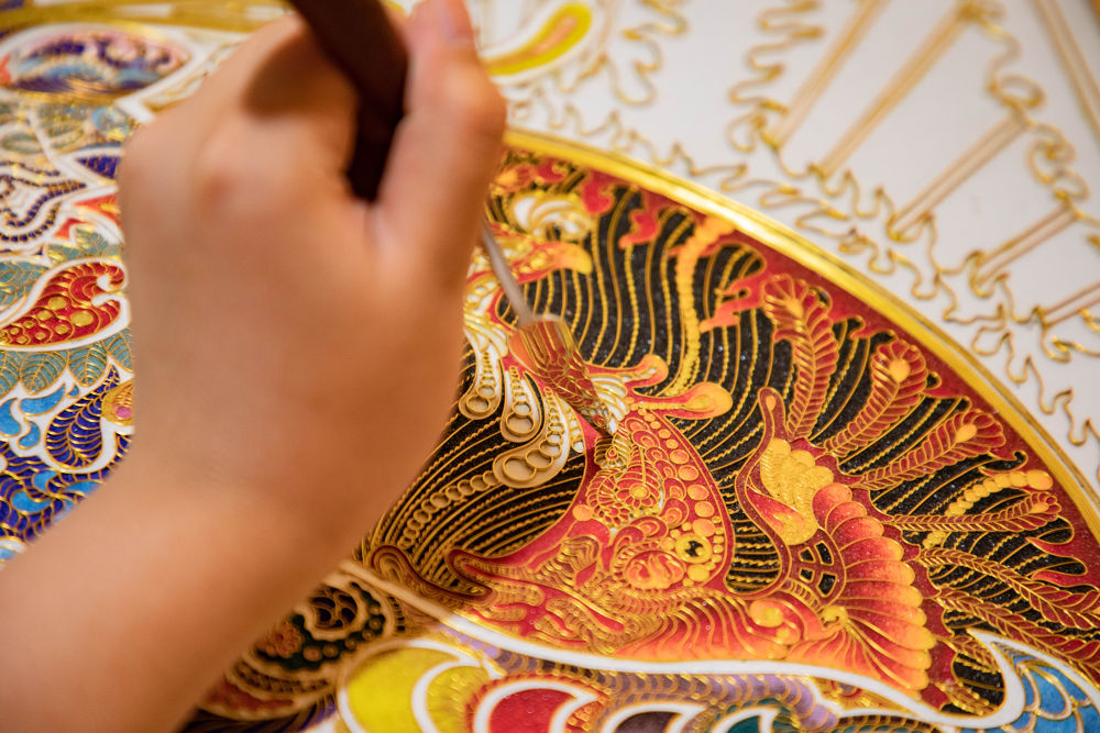 此后30多年,李海明不斷傳承創(chuàng)新,將排絲、壘絲、螺旋絲、柱狀絲等鑲嵌技法引入掐絲琺瑯?biāo)囆g(shù),利用100多種基礎(chǔ)琺瑯釉料調(diào)制出4000多種過渡色及配色,攻克了琺瑯壁畫釉料脫落的難題,提升了琺瑯壁畫作品的藝術(shù)價值和收藏價值。截至目前,他共創(chuàng)作2000多幅掐絲琺瑯壁畫作品,先后30多次獲國家級和省級工藝美術(shù)類大賽金獎,部分作品被國家博物館收藏。