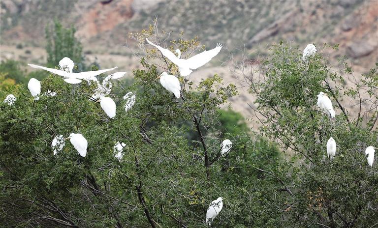 中國甘肅網(wǎng)10月14日訊 據(jù)蘭州日報報道 金秋十月,蘭州新區(qū)秦王川國家濕地公園秋意漸濃。近日,隨著近百只白鷺的光臨,秦王川國家濕地公園再次迎來了候鳥遷徙的高峰期,成群的白鷺憩息在樹枝,繪就了一幅亮麗的秋景圖。