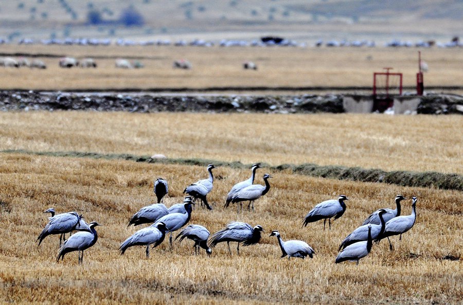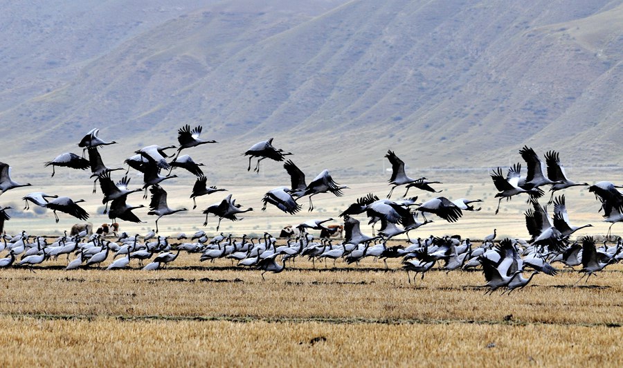 人民網(wǎng)蘭州10月10日電 (記者高翔)寒露至、候鳥(niǎo)遷,甘肅省肅南裕固族自治縣皇城鎮(zhèn)夏日塔拉草原迎來(lái)數(shù)千只蓑羽鶴,它們?cè)跐竦氐乃嫔?、草叢中或悠閑覓食、或蹁躚起舞,與色彩斑斕的草原構(gòu)成了一幅和諧優(yōu)美的生態(tài)畫(huà)卷。