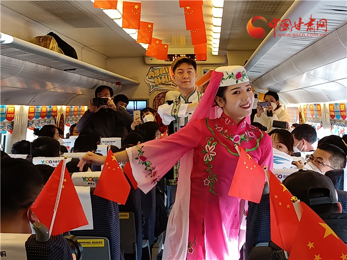 飛天與花兒相擁,甘肅與寧夏直通。蘭銀高鐵中蘭段開通,也讓銀蘭高鐵全線貫通。為了慶祝這一歷史時刻,D9058次列車乘務(wù)組準(zhǔn)備了精彩的節(jié)日?!痘▋号c少年》展演寧夏風(fēng)情,遇見塞上花開。敦煌樂舞,充滿甘肅元素講述飛天故事,巧妙的節(jié)目安排生動地展示了甘肅、寧夏兩省區(qū)的文化元素,讓旅途不僅有一路風(fēng)光,更有一路風(fēng)情。