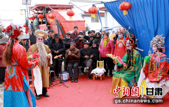 中新網(wǎng)甘肅新聞2月8日電 (朱玲)農(nóng)歷正月,走進(jìn)華亭市西華鎮(zhèn)西塬村,山村隱掩處,遠(yuǎn)遠(yuǎn)聽聞古樸蒼勁的戲曲腔調(diào)傳來(lái)。村部院落里,村民或站或蹲,里三層外三層地將表演者圍了個(gè)水泄不通。