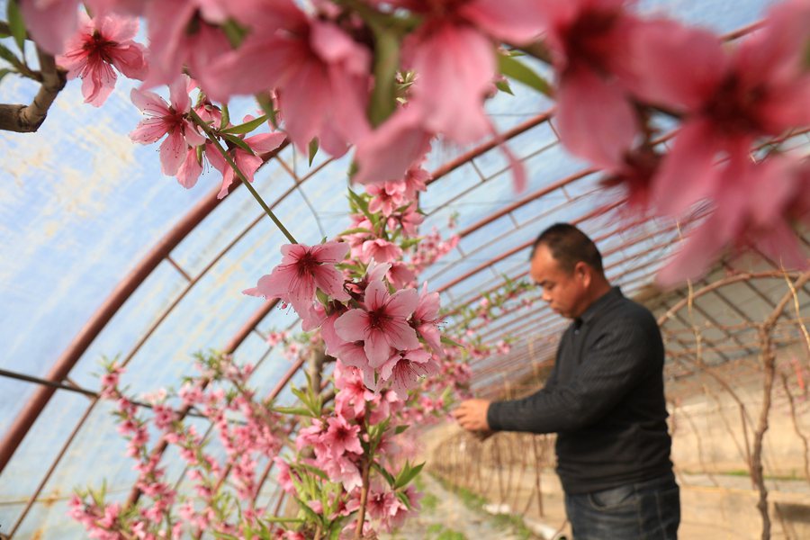 初春時節(jié),甘肅省敦煌市七里鎮(zhèn)戈壁設(shè)施農(nóng)業(yè)示范園區(qū)溫室中的桃花競相綻放,濃濃春意撲面而來,農(nóng)民忙著為桃樹壓枝、疏花,加強田間管理,為今年豐產(chǎn)豐收打牢基礎(chǔ)。