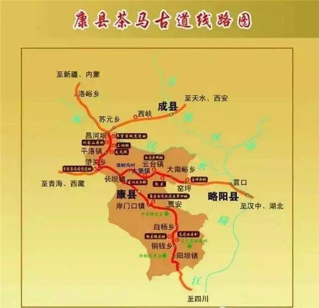 甘肅境內(nèi)的茶馬古道大致走向如下:茶葉由四川進入文縣,沿白龍江到達武都,經(jīng)宕昌到岷縣進而進入藏族地區(qū);由陜西進入隴南,經(jīng)成縣、西和到天水,經(jīng)甘谷、武山到達臨洮,在此可以分出兩條路徑,向北可達蘭州等地,往西可進入臨夏,進而進入藏族地區(qū)。