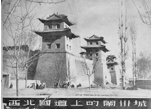 特別難得的是,他拍下了一張?zhí)m州城樓的照片,這是筆者見(jiàn)過(guò)的所有蘭州城樓中最壯觀的。照片上,中間的城門和兩個(gè)角樓并行排列,角樓前面是幾株西北地區(qū)常見(jiàn)的高聳挺拔的白楊樹(shù),角樓底下是幾個(gè)正在等客人的黃包車夫。這座城樓是蘭州東郭城門迎恩門,俗稱東稍門(位于今東方紅廣場(chǎng)東口什字),中間有城門洞,南北兩側(cè)為角樓,無(wú)城門洞。
