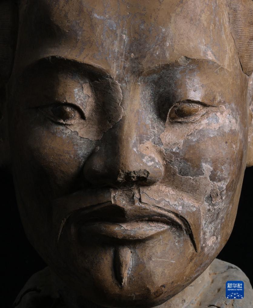 這是秦俑臉部和衣領(lǐng)上的彩繪還原修復(fù)后的樣貌(8月23日攝)。