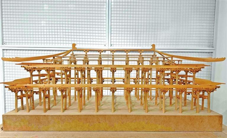 “這是兩個學(xué)生共同完成的,是按照大明宮含元殿的木制結(jié)構(gòu)圖制作的。”彭維新說。