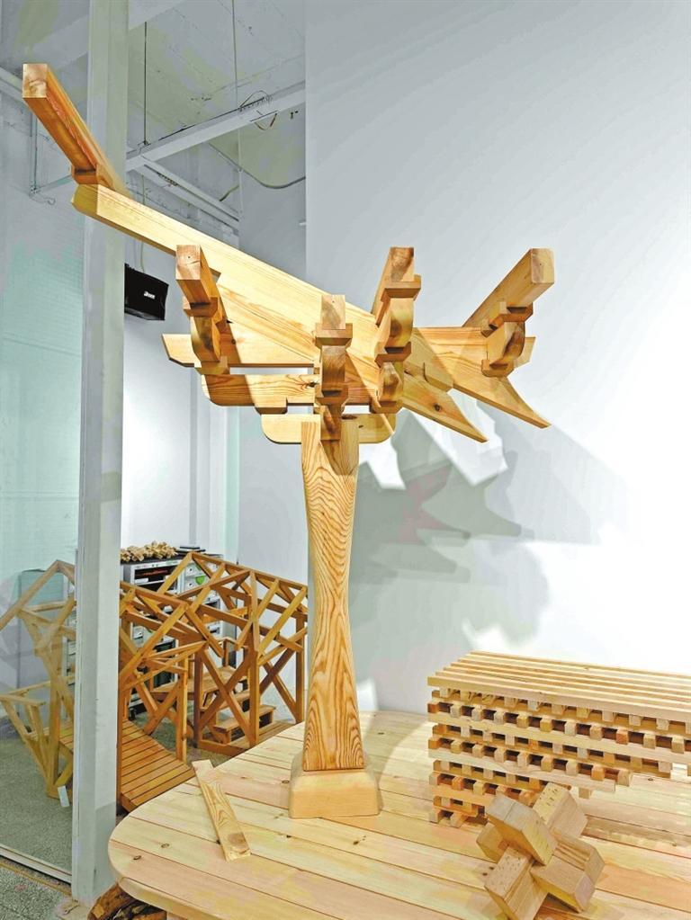 眼前,記者看到一件榫卯結(jié)構(gòu)的建筑作品氣勢不凡。