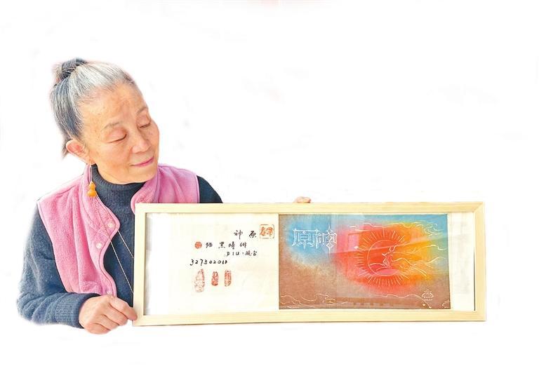 阮琦向記者介紹了具體的拓印方法:首先要把一張噴濕的宣紙敷在陶板上,用拓印的工具一點一點拓印,待紙張干燥后繼續(xù)噴水……使水彩顏料均勻地拓在宣紙上,然后把紙揭下來,一張拓片畫就完成了。