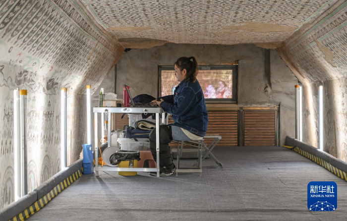 在敦煌莫高窟正在保護(hù)修繕的第55窟內(nèi),一位文保工作者對(duì)采集的數(shù)據(jù)進(jìn)行整理(2023年8月3日攝)。新華社記者 李賀 攝
