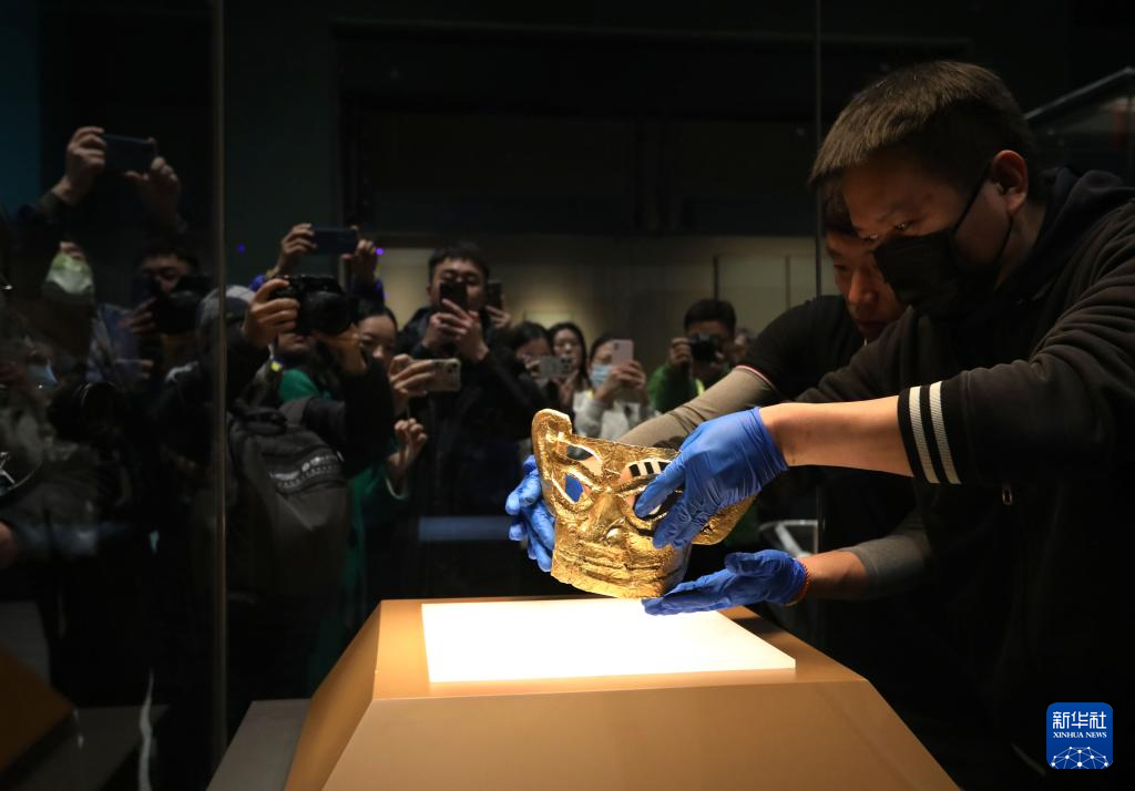 當(dāng)日,四川廣漢三星堆遺址出土的珍貴文物——金面具和豎披發(fā)青銅人像在上海博物館東館特展廳內(nèi)開(kāi)箱,移入展柜。坐落于黃浦江東岸的上海博物館東館將于2月2日啟用,開(kāi)幕展覽“星耀中國(guó):三星堆·金沙古蜀文明展”將對(duì)公眾開(kāi)放。