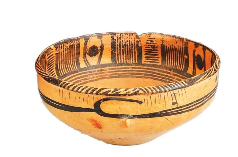 這件距今5000多年的古代彩陶作品,制作精致,圖案精美,人物形體鮮明,造型和動(dòng)作既抽象又生動(dòng)。彩陶盆通高11.3厘米,口徑24.5厘米,底徑9.8厘米,細(xì)泥制作,唇外侈,略鼓腹,腹部?jī)蓚?cè)有對(duì)稱的小鈕??谘貎?nèi)壁為四組雙人抬物圖案,中間以橫豎線條組成的幾何圖案間隔,形成一周四方連續(xù)的紋飾帶,繪制于陶盆內(nèi)側(cè)上部,二人的頭部以圓點(diǎn)代表,軀干和四肢以線條描繪。兩人相向站立,共同抬起一個(gè)碩大的圓形物體,畫面簡(jiǎn)潔而生動(dòng),寥寥數(shù)筆就將人抬重物時(shí)雙腿開立、腰背微屈用力的形態(tài)刻畫得惟妙惟肖。陶盆上精妙的紋飾讓它成為我國(guó)最早在彩陶上表現(xiàn)原始先民勞作場(chǎng)景的藝術(shù)珍品。