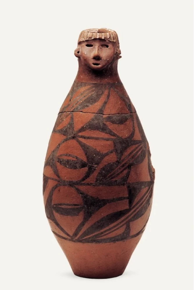 隴東少女作為甘肅的“顯眼包”之一,是曾在《國(guó)家寶藏》中出現(xiàn)過的“網(wǎng)紅”、甘肅省博物館鎮(zhèn)館之寶,它于1973年從秦安縣大地灣遺址出土。具有高度審美能力的“托尼”老師,設(shè)計(jì)了齊劉海發(fā)型,顯得很泰酷辣,圓鼓腹、平底,人們細(xì)看發(fā)現(xiàn),陶人的兩眼為圓孔洞,顯得目光深邃;鼻子呈蒜頭形,雕有鼻孔;嘴較小,微微張開,好像正在言語(yǔ);兩耳外展,皆有穿孔;瓶體從上至下以黑彩飾三層大小相同、由弧線三角紋和斜線組成的二方連續(xù)圖案,以示華麗的衣物。另外,陶瓶人頭像的器口運(yùn)用了不同的制作手法,頭發(fā)、嘴系雕刻而成,鼻、臉是捏塑而成。人頭像五官整齊、面龐秀麗,器身造型典雅,與人物形象渾然一體,既是大地灣文化彩陶的代表作,也是中國(guó)史前集彩繪、雕塑與造型藝術(shù)于一身的杰作。估計(jì)任誰看一眼,都會(huì)被“她”的神秘和美麗所吸引吧。
