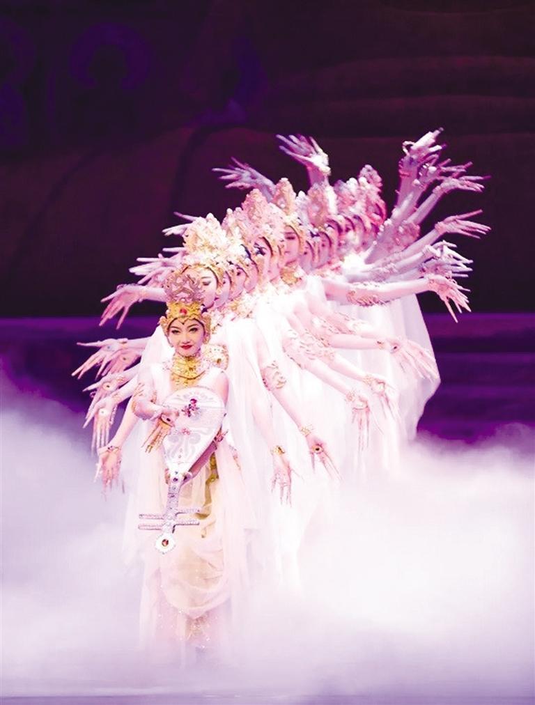 經(jīng)典舞劇《絲路花雨》歷經(jīng)45載,累計(jì)演出3952場(chǎng),觀眾達(dá)537.47余萬人次,享有“中國(guó)民族舞劇的典范”“東方的《天鵝湖》”之稱。演出現(xiàn)場(chǎng),劇中經(jīng)典舞蹈選段《金光千佛》《反彈琵琶》《霓裳羽衣舞》《夢(mèng)幻伎樂天》為游客粉絲和廣大觀眾繽紛綻放,引發(fā)陣陣歡呼。“反彈琵琶”源自莫高窟第112窟的反彈琵琶樂舞圖,“千手觀音”還原了莫高窟元代3窟中的千手千眼觀音圖,“活著的敦煌壁畫”、獨(dú)創(chuàng)的“S”形舞姿讓游客沉浸式感受絲路文化藝術(shù)的魅力。