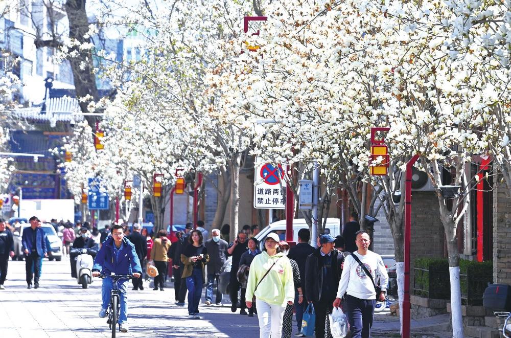 ▲天水秦州古巷里盛開(kāi)的玉蘭花,讓游客駐足觀賞。