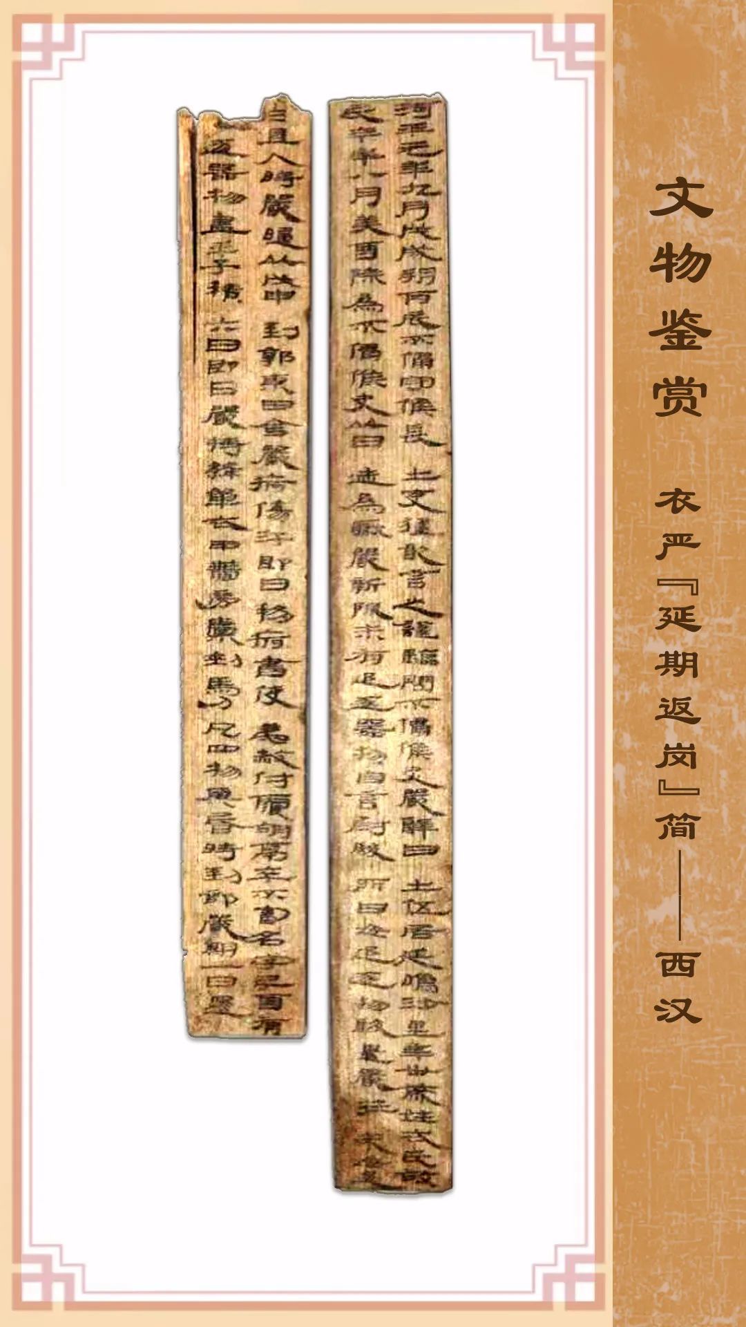 此簡于1974年在甲渠候官遺址第59號探方出土,松木材質,共兩枚簡。首枚內容完整,23厘米長,2.5厘米寬,0.4厘米厚;另一枚上端略有殘斷,20厘米長,2.6厘米寬,0.4厘米厚。墨跡清晰,標準漢隸書寫,流暢自然,結構工整,是一份案劾文書。