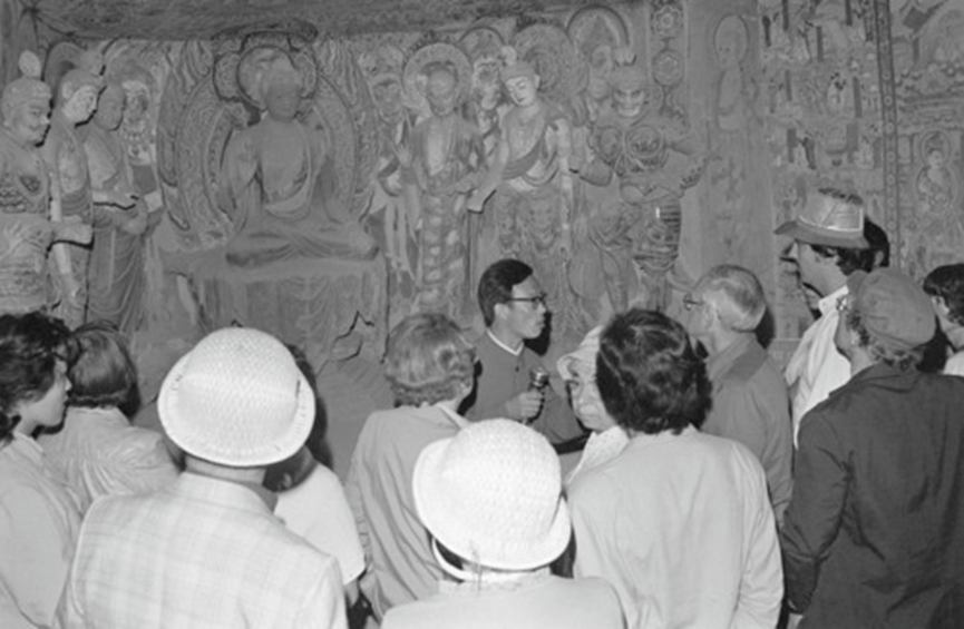 舉世聞名的文化寶庫(kù)和藝術(shù)明珠——敦煌莫高窟吸引了亞、歐、美三大洲的旅游者。新華社記者李生才攝(1986年5月18日發(fā))