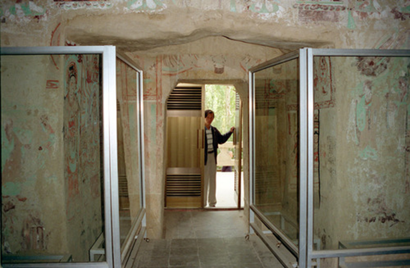 圖為莫高窟的367個(gè)洞窟安裝了鋁合金窟門(mén),并在94個(gè)開(kāi)放的洞窟安裝了玻璃屏風(fēng),即保護(hù)了壁畫(huà)的彩塑,又不影響參觀者視線。新華社記者彭張青攝(1996年11月24日發(fā))