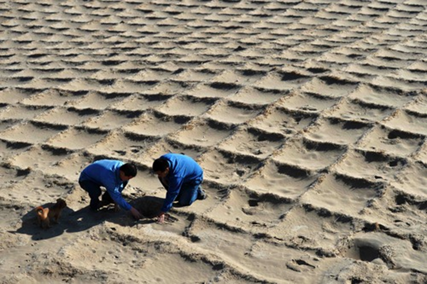 記者從敦煌研究院了解到,到2014年,經(jīng)過(guò)70年持續(xù)風(fēng)沙治理,風(fēng)沙對(duì)敦煌莫高窟的危害顯著降低,進(jìn)入窟區(qū)年積沙量減少85%以上。據(jù)敦煌研究院保護(hù)所副所長(zhǎng)汪萬(wàn)福介紹,在幾代治沙人的努力下,莫高窟頂已形成由防沙障阻沙、沙生植物林帶擋沙、麥草方格沙障固沙和礫石壓沙組成的風(fēng)沙防治綜合體系,極大減緩了風(fēng)沙對(duì)敦煌壁畫(huà)和塑像等文物的危害,改善了窟區(qū)生態(tài)環(huán)境。圖為2014年8月29日,兩名工作人員檢查用于固沙的麥草方格。新華社記者陳斌攝