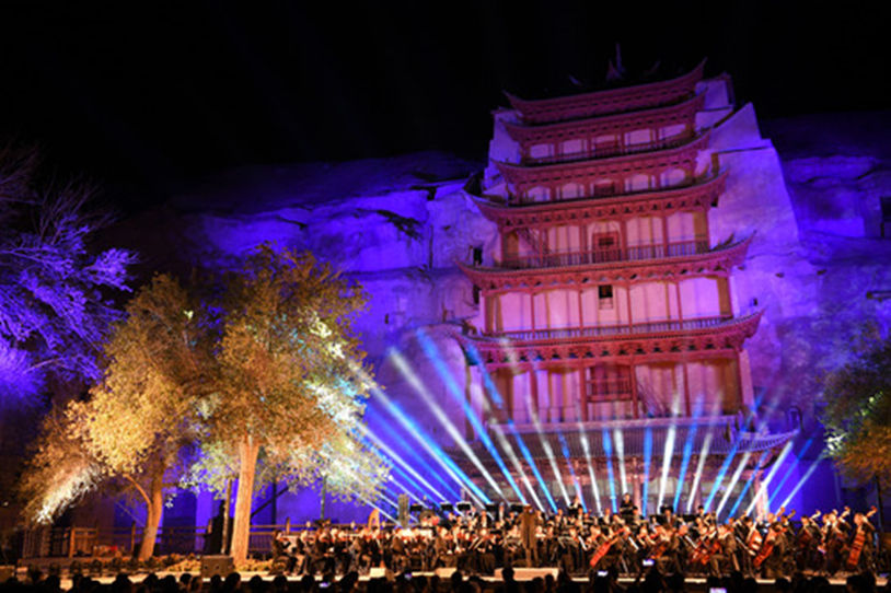 2016年9月15日,首屆絲綢之路(敦煌)國(guó)際文化博覽會(huì)系列活動(dòng)之一的敦煌莫高窟1650周年紀(jì)念音樂(lè)會(huì)在莫高窟舉行。著名指揮家陳?ài)脐?yáng)、特邀音樂(lè)家趙聰?shù)人囆g(shù)家奉上了具有絲綢之路沿線諸國(guó)特色的經(jīng)典曲目,2000余名觀眾在莫高窟九層樓廣場(chǎng)前追憶絲綢之路的璀璨歷史,聆聽(tīng)穿越古今的藝術(shù)交響。
