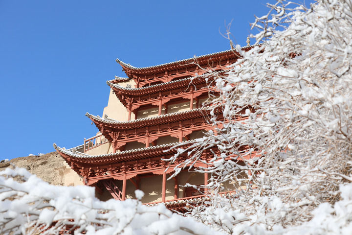 2022年3月24日至25日,甘肅省敦煌市迎來(lái)一場(chǎng)春雪。雪后的世界文化遺產(chǎn)敦煌莫高窟銀裝素裹,景色如畫(huà)。圖為3月25日拍攝的雪后的敦煌莫高窟景區(qū)九層樓。新華社記者李俞輝攝