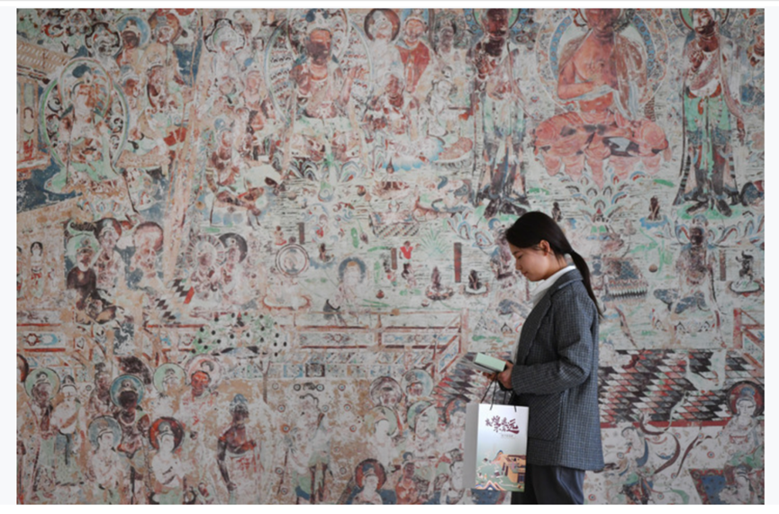 圖為敦煌研究院文物數(shù)字化保護(hù)團(tuán)隊(duì)創(chuàng)意營(yíng)銷(xiāo)人員廖雪婷從一幅高保真復(fù)制壁畫(huà)前走過(guò)(2023年4月25日攝)。新華社記者陳斌攝