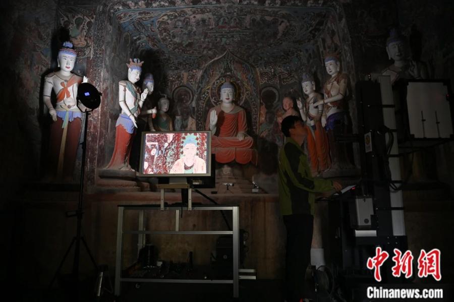 2024年6月,甘肅敦煌莫高窟內(nèi),敦煌研究院文物數(shù)字化研究所工作人員進(jìn)行敦煌壁畫(huà)數(shù)字化采集工作。李亞龍 攝