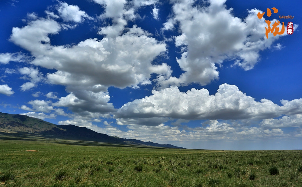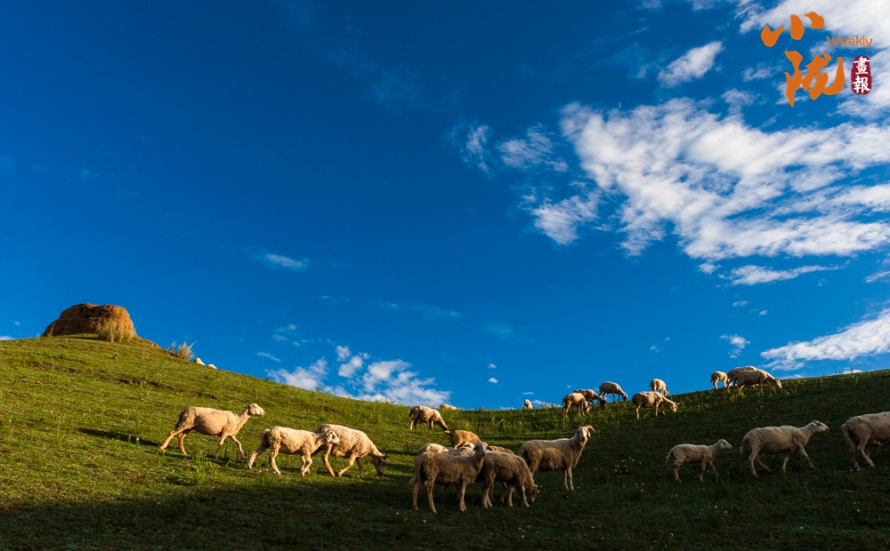遠(yuǎn)處白云悠悠,百萬畝草原一望無垠,羊群點(diǎn)綴的大草原和那殘存的烽火臺相映成趣,呈現(xiàn)出一幅綠意盎然的詩意畫卷。