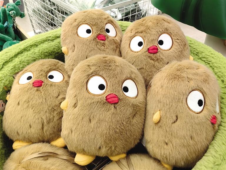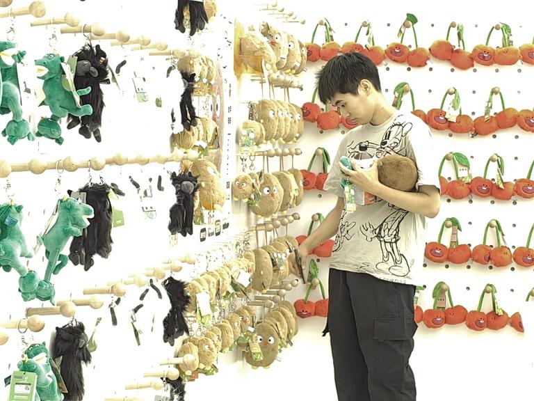 此時(shí),目不暇接的花式文創(chuàng)在店內(nèi)“爭(zhēng)奇斗艷”,爭(zhēng)當(dāng)“顯眼包”,等待被主人帶回家。掀開店內(nèi)一只毛絨收納箱,一窩土豆子撲閃著大眼睛向你眨眼。都說轉(zhuǎn)角遇到愛,誰(shuí)料,轉(zhuǎn)角處粉嘟嘟的“拿捏玩偶娃娃公仔”捏著一個(gè)小蓮花花苞在向你招手。一回頭,造型別致的文創(chuàng)飾品精美又時(shí)尚,一側(cè)的帆布包上印著“別卷我”。就連記者逛下來,都入手兩件文創(chuàng)。