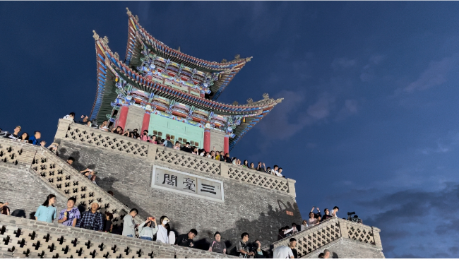 夕陽西下,夜色漸濃,三臺閣上游人如織,山下的萬家燈火隨著夕陽余暉的隱退漸漸蘇醒,一盞盞燈光次第亮起,璀璨如星海。人們紛紛舉起手機和相機,記錄下這一刻的美好。“真不愧是金城蘭州,站在這里俯瞰蘭州是什么神仙視角!”“終于知道夜晚的蘭州為啥被稱作‘蘭哈頓’了,回去好好跟朋友炫炫……”來自陜西的大學(xué)生小劉和他的小伙伴們一邊尋找拍照最佳角度,忍不住發(fā)出贊嘆。在這一刻,古老的閣樓與游客一起沉醉在蘭山的夏夜晚風(fēng)中。