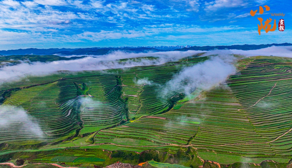 萬(wàn)畝碧綠的梯田從山腳盤繞著直至山頂,高低錯(cuò)落,層層疊疊伸向遠(yuǎn)方,遠(yuǎn)遠(yuǎn)望去,像“條縷清晰”的調(diào)色板,在藍(lán)天白云的打扮下,壯現(xiàn)絢爛。